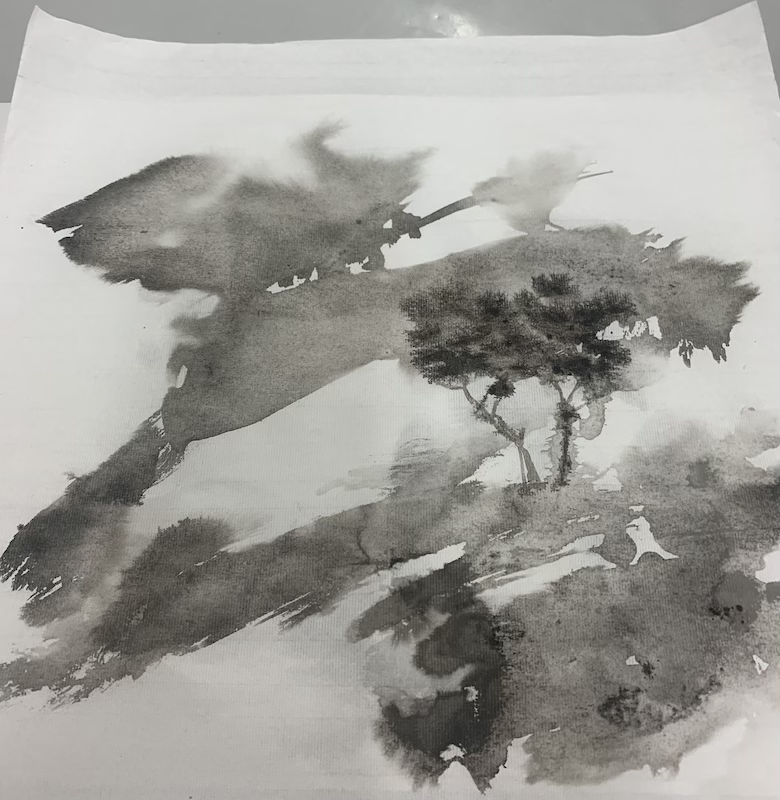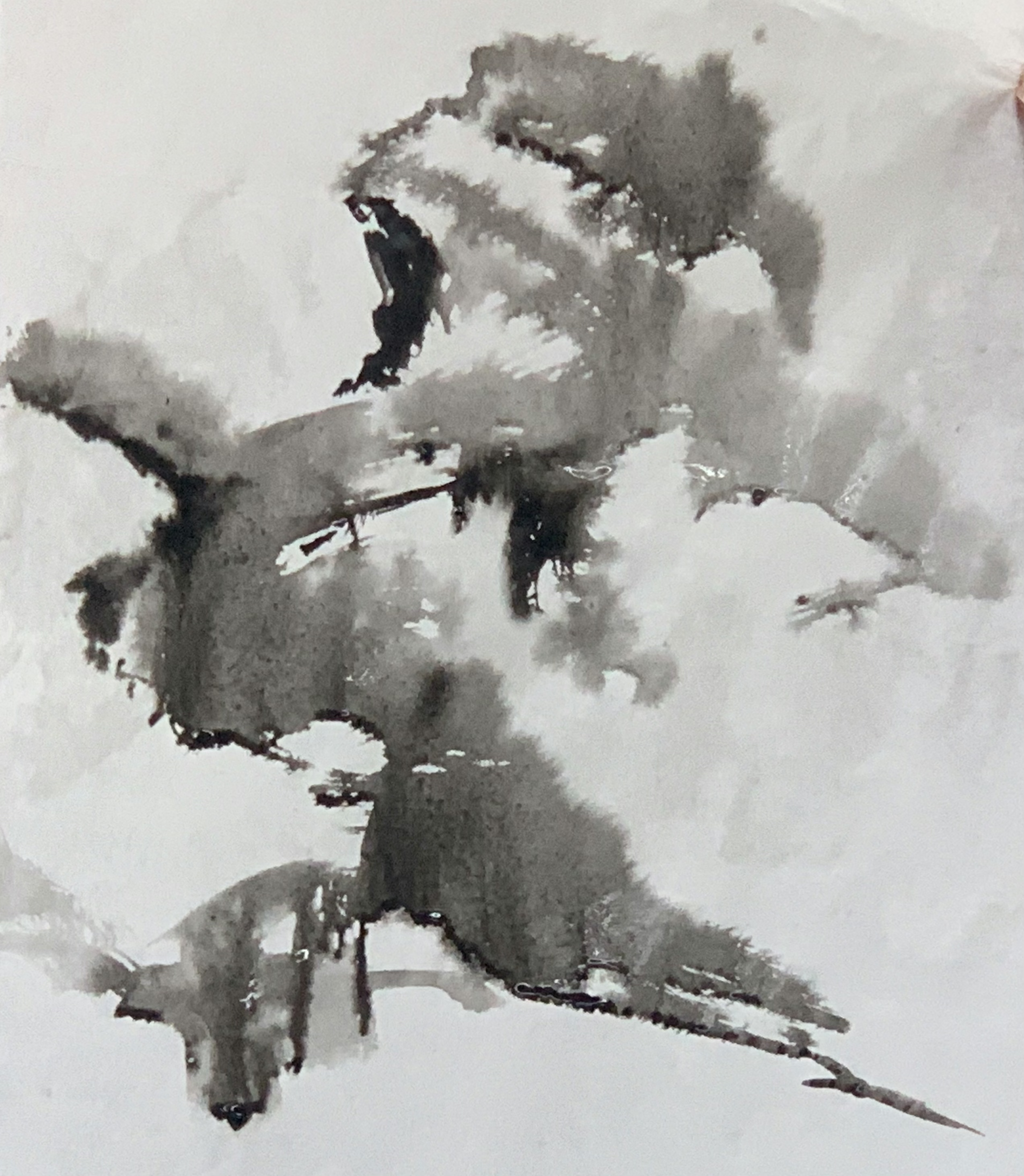 "Brave at the beginning, gentle at the end." The trick was: it didn't need more rocks, more mountains, or clouds. It could be misty and vague and sketchy. The instructor looked over my shoulder and suggested two small changes, and then setting down my brushes: fade out around the weird thin streak in the sky, and darken the lowest ink blob a bit to suggest a cliff, with a flat area on top where the trees are growing.